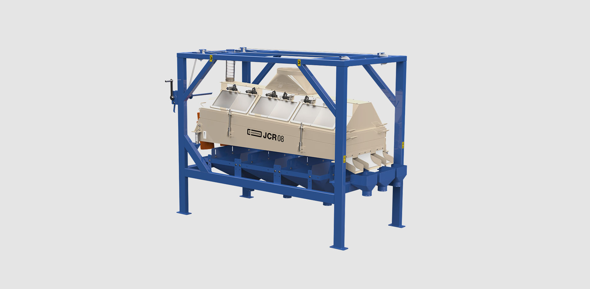 The JCR Air Sieve Classifier is designed for straightforward operation and maintenance. The sieves are kept clean by rubber balls which bounce inside them. The access to change sieves is simple and they may be quickly and easily swapped by one person. There are numerous sampling points allowing regular product checks and adjustment of settings.