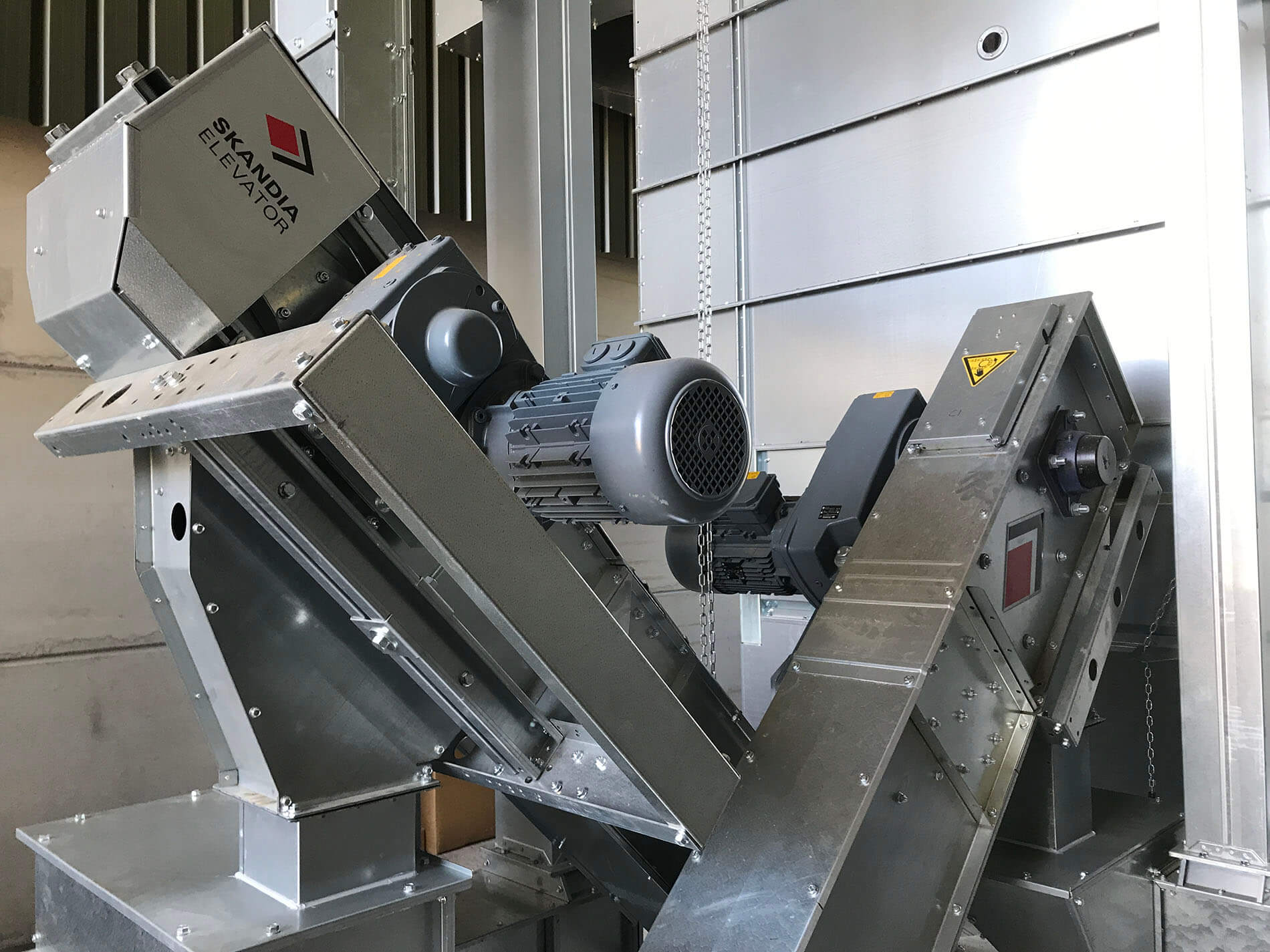 Design features including the unique high tensile strength chain, direct drive Nord motor gearboxes and sealed bearing units set the range of Skandia Elevator chain and flight conveyors apart. Skandia Elevator offer a complete range of grain handling equipment including chain and flight conveyors, belt and bucket elevators, sweep conveyors and belt conveyors. All machine capacities are uniquely designed to ensure seamless integration. A comprehensive range of ducting allows machines to be simply and effectively linked supporting quick and straightforward installations.